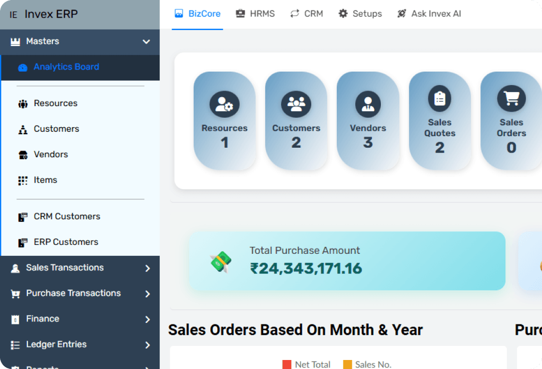 Invex ERP brings together powerful modules like ERP, HRMS, and CRM